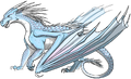 An IceWing's scale pigmentations can range from silvery white colors to pale shades of blue. Their coloring has been described as "silver like the moon", "pale blue like ice", or "the color of the sky-filled snow." Most Icewing scales are shades of light blue. Like RainWings they have a ruff, however theirs is of extra horns, sharp and shaped like icicles. IceWing heads are usually shaped like diamonds, and in other words, are very narrow. With that in mind, they are very swift, compact, and skinny dragons that also have surprisingly strong but narrow whip-like tails with extra icicle-shaped spines, being very sharp at the tip of the tail. IceWings have blue, black, or stormy gray eyes, forked blue tongues, blue blood, and ridged, extremely sharp talons to grip the ice while traveling by talon around their habitat.