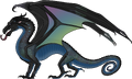 According to Secretkeeper, when Moonwatcher hatched in the prologue of Moon Rising, she had shiny scales, claws like miniature curved crescents, and a perfect tail. She is more healthy and well-fed in appearance compared to the other NightWings who had been living on the island.[1] Moon's wings probably have the genetic snail shell pattern of stars, due the the fact of her father, Morrowseer, had that pattern on his wings too. She has a silver scale shaped like a teardrop on the outside corner of each dark green eye that shows her status as a mind-reader; they are described by Secretkeeper as "odd but beautiful."[1] They are "larger and more sparkly" than Fatespeaker's teardrop scales. She has light gray scales on her top scales and midnight black scales for a base, she has the same silvery gray underscales as all the other NightWings, and she wears a soft black leather pouch held with chains around her neck for her library card.[2]