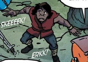 After Clay and Tsunami escaped from their guardians, they encountered a human, who was revealed in Dragonslayer to be Mushroom. Tsunami commented that she had thought they would be more ferocious, and Clay asked if they could eat it. It had stolen Queen Scarlet's treasure, carrying it in a bag over its shoulder, so Queen Scarlet then flew down and bit off his head.