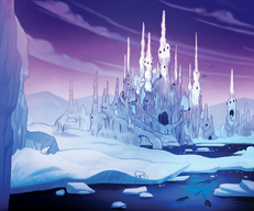 The Ice Kingdom's land is mostly snowy, icy, cold tundra, with multiple glaciers adding to the overall shape of the kingdom. It is cold enough that almost everywhere is covered in snow. Darkstalker said that for tribes besides IceWings, the Ice Kingdom would be horrible to conquer. The map of Pyrrhia shows that there are areas of mountain and boreal forest in the Ice Kingdom, which are also snow-covered. Icebergs, ice sheets, and ice floes litter the sea around the kingdom.