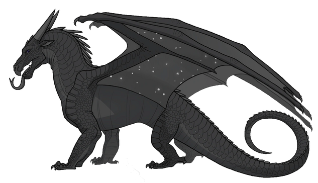 NightWings have been described to have forked, pitch-black tongues, as well as dark scales which are usually black or in shades of dark green, blue, or purple. They have silver, purple, dark green, or blue underbellies, and dapples of silver scales running along their necks. Their wings have silver scales scattered across them like the stars of a night sky, forming different patterns. These patterns are genetic.[1] NightWings have been described with black, dark blue, dark brown, purple, or dark green eyes. They have beak-like snouts as shown in the graphic novels. They have straight horns.[2]