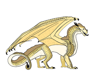 Qibli is a a good looking sand wing ( Mentioned by Moon and a few others) that has light yellow scales with a few brown freckles on his snout and yellow wings.[1] He has a small, rakish scar zigzagging across his nose, received from his mother, Cobra.[2] He wears one gold earring in his right ear with a warm orange amber teardrop hanging from it.[3] He is wiry, narrow-shouldered, and around the same size as Winter [4] but mentioned to be a little bigger.