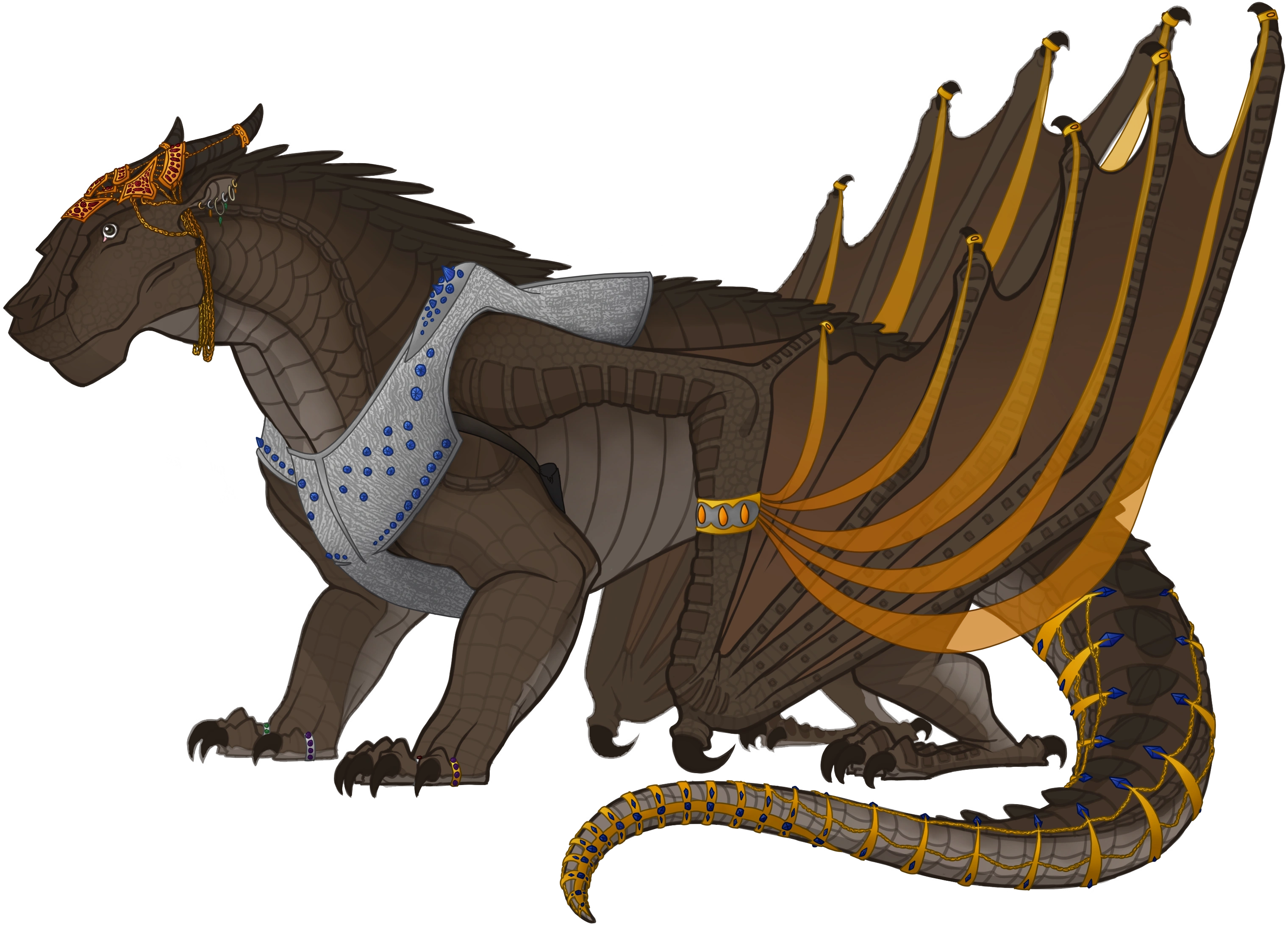 Bog has mud-brown scales[5] and is almost completely covered in different kinds of jewelry: gold chains around his neck that dangle from an elaborate ruby-encrusted headpiece clashing with the rows of silver, emerald, and topaz earrings in each ear; silver chain mail studded with sapphires on his chest; golden silk veils wreathing his wings;[6] giant bejeweled rings on his talons;[7] and a gold tail band shaped to look like dragon claws clutching every inch of his tail, each claw tipped with a sapphire.[6] He also wears a pouch tied firmly under one of his wings where he kept his pieces of Darkstalker's scroll.[8]
