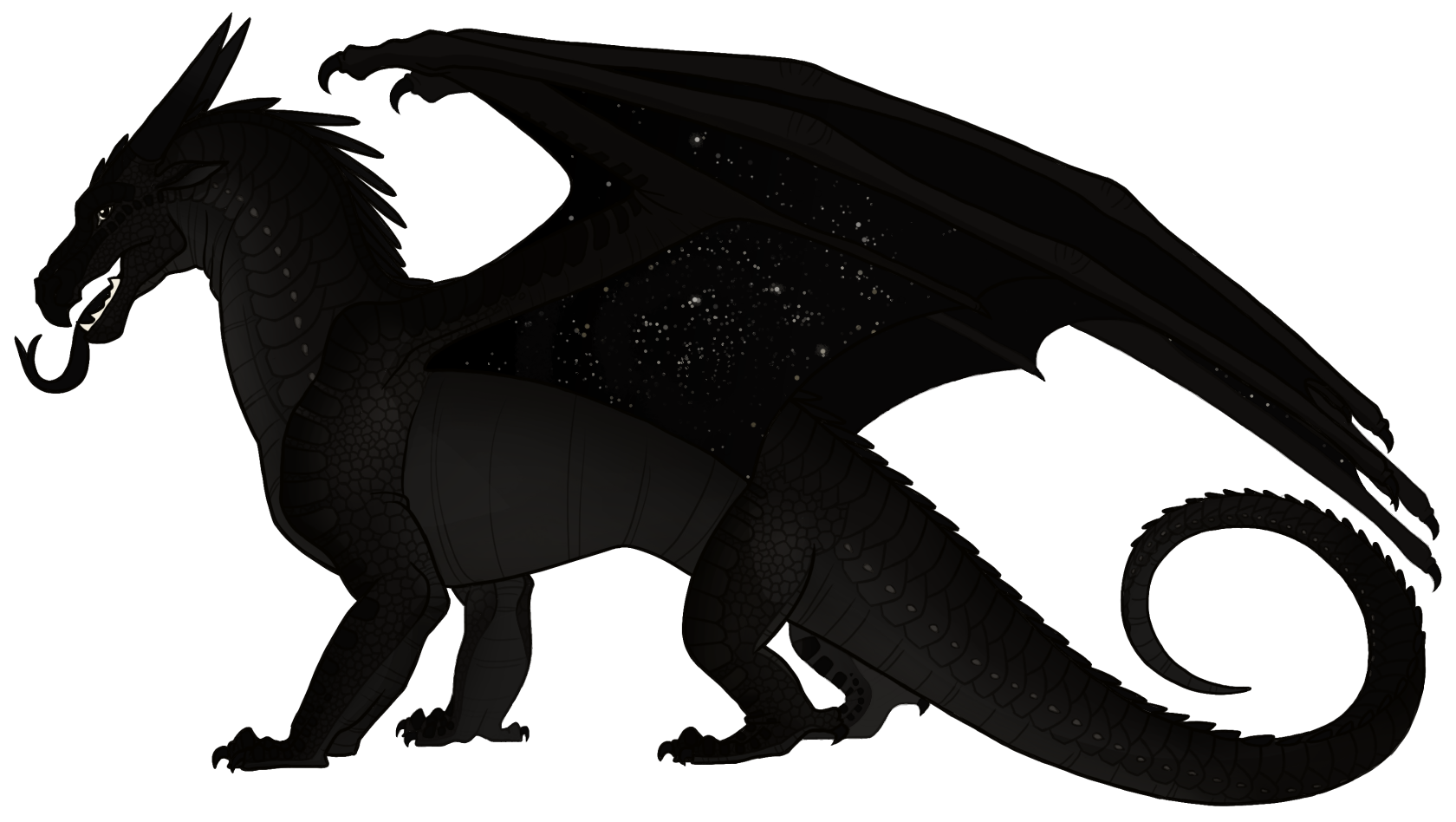Morrowseer had black-on-black scales[1] that were described to look like a bottomless pit.[2] The star scales on the underside of his wings curled inward like a snail shell[3] and glittered from a great distance, casting a cold glow.[2] He had heavy talons,[4] black eyes, a black snout, strong claws[5] and bright white teeth, as well as light gray spikes running down his back.[1]