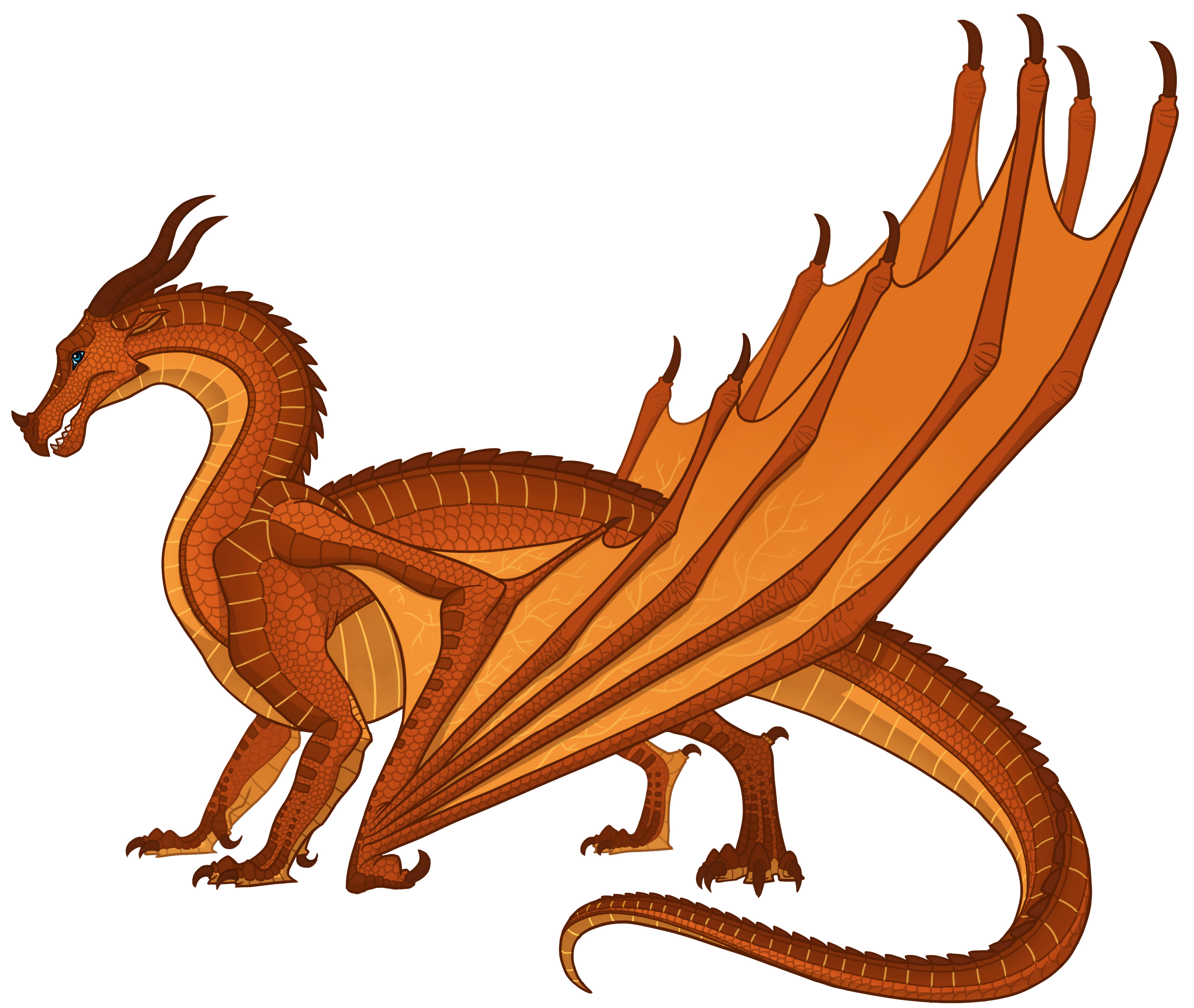 Peril has unusually bright,[1] incandescent,[2] glowing,[3] shimmering,[4] copper-colored,[5] fiery,[6] metallic-orange scales[7] that emit smoke and heat, giving her the appearance of burning from the inside.[1] Smoke also comes from her mouth and nose often.[8] She has a long, pointed tail,[9] with veins of gold running through her glimmering copper wings,[8] as well as strange, sinister,[1] sly,[10] startling,[8] eerie,[11] sharp,[12] flame-blue[13] and black eyes,[14] as though someone had bundled up the sky and immersed it in fire until it burned from the inside.[1] Her eyes have also been described to be like two small blue flames blazing through the smoke.[8] She has sharp white teeth that are not yet stained or blunted and horns that are full size,[15] and her scales emit a blistering,[11] burning heat that feels like standing too close to an erupting volcano.[16]