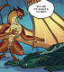 Peril initially only wanted to be friends with Turtle because Clay would have wanted her to make friends.[156] Though she was irritated by the way he lounged around in dimly lit caves, as it caused her to almost run into him.[157] She made him laugh, although he considered her strange,[32] but she later snapped at him and stated that he was boring and forgettable, although Turtle did not take offense, simply stating "I know. I try to be".[158] Turtle later insisted on accompanying Peril to kill Scarlet, despite her bantering with him to stay at the academy.[159] She was willing to admit to him that she was not entirely happy under Scarlet in the Sky Kingdom,[19] and he giggled when he accidentally hit her with a fish.[160] He laughed at her intense disgust at tasting raw fish for the first time, and was serene when she joked about setting him on fire as payback.[161]